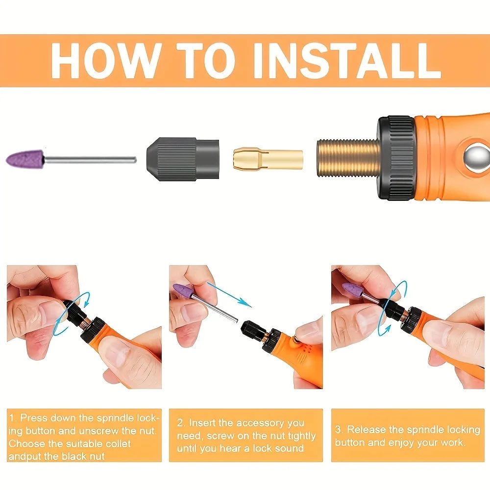 This power tool come with 5 collet sizes(1mm,1.6mm,2.35mm,3.0mm.3.2mm), to fits different suitable accessories and it is easily changed.