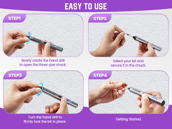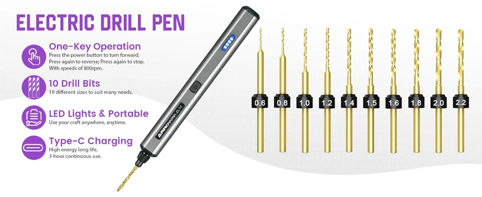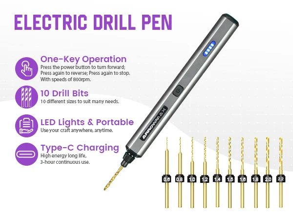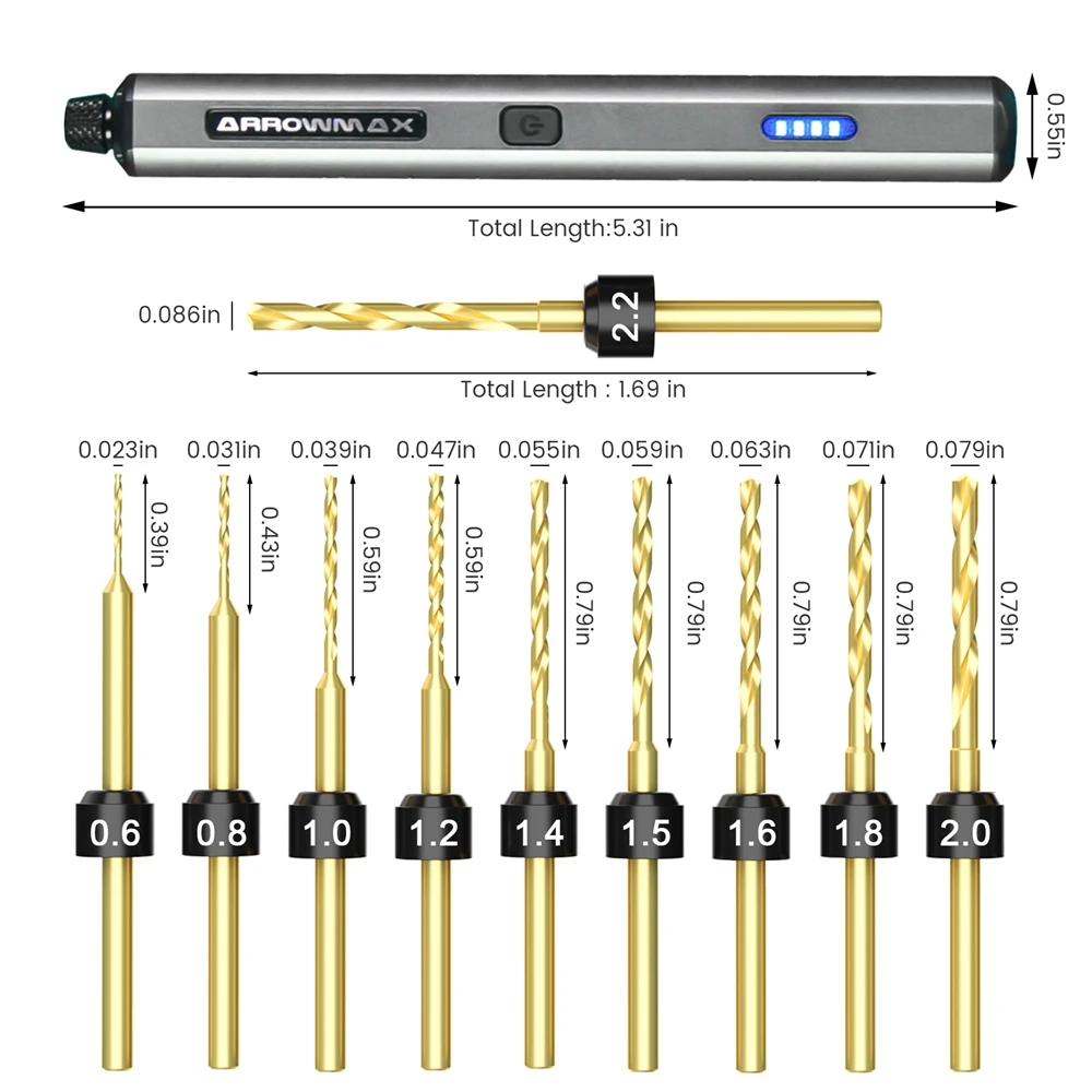 Versatile Drill Bits: Includes 10 precision bits (0.6mm-2.2mm) with a universal 2.35mm shank. Effortlessly drills through plastic, wood, shells, and more—no tools needed for bit changes.