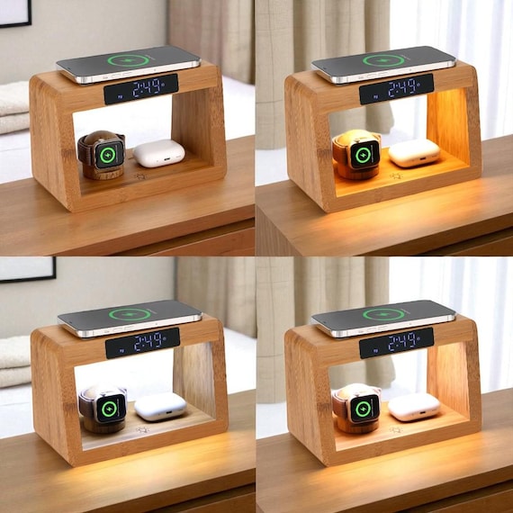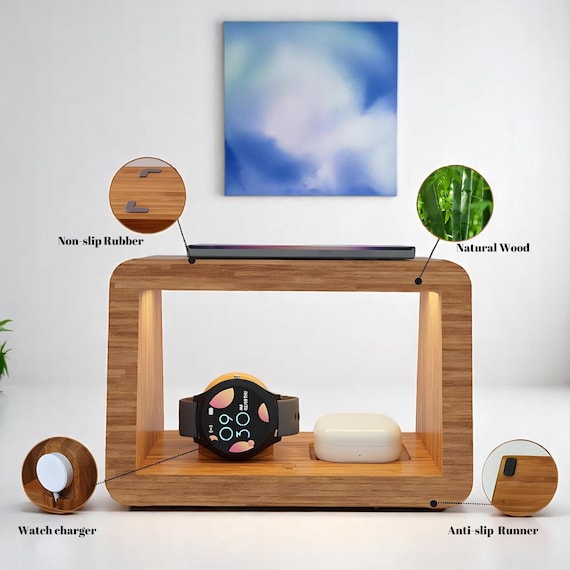 Declutter your space and charge your essentials in style with this sleek 3-in-1 Wooden Wireless Charging Station. Designed with modern minimalism in mind, this elegant bamboo dock features integrated Qi charging for your smartphone, a designated space for your smartwatch and earbuds, plus a warm LED light for added ambiance. Perfect for your nightstand, office desk, or entryway, it’s a tech-savvy organizer that blends beautifully with natural decor.