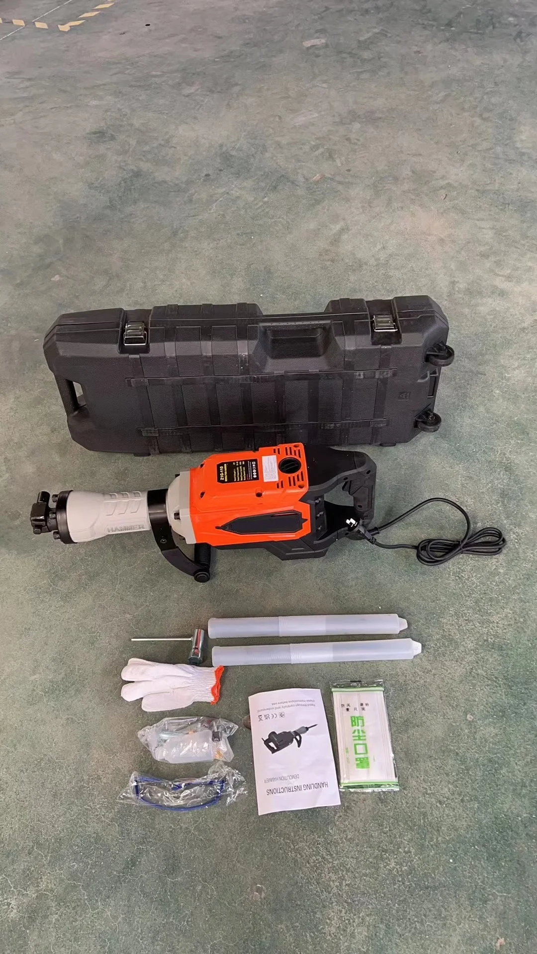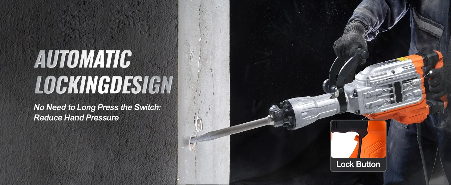 Designed To Go Above And Beyond: The upgraded shock absorption structure, adding double springs, can save more effort. The 360°rotary handle reduces fatigue during prolonged work. It provides accuracy and precision in some relatively narrow places. The demolition hammer is also equipped with a suitcase for carrying conveniently. The locking button can automatically maintain operation, saving effort.