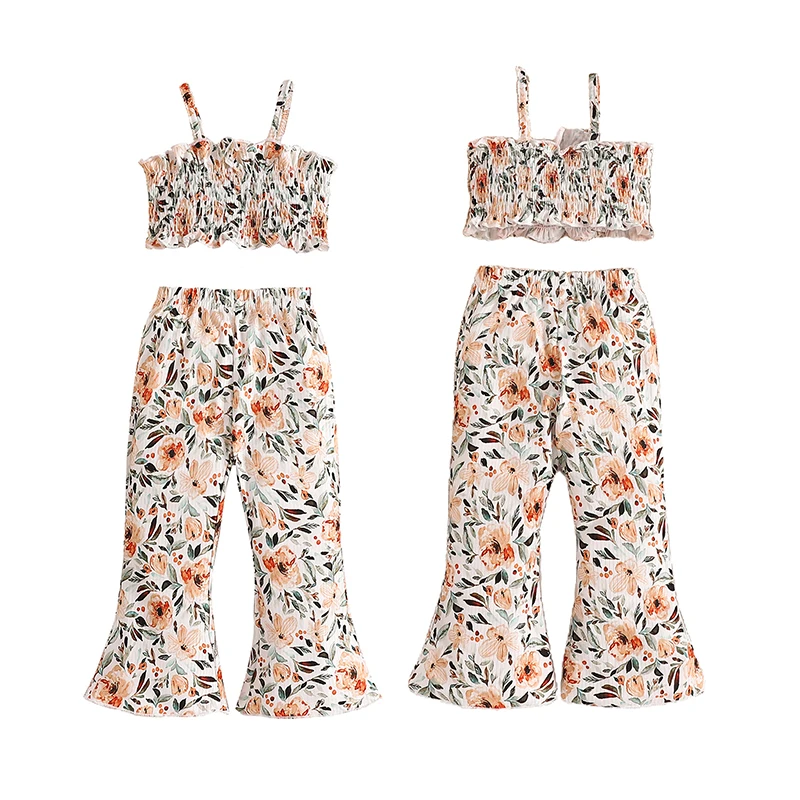 Girls Summer 2PCS Pants Sets Sleeveless Ruched Floral Camisole Flared Pants Sets
