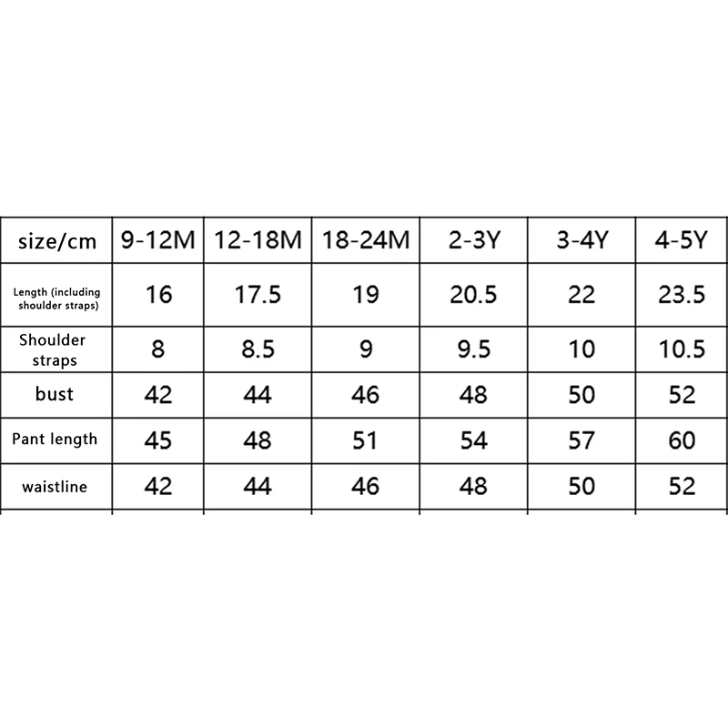 3-4YTops Length: 8.66 Bust: 19.68 Pants Length: 22.44 Waist: 19.68 Advised Age: 3-4 Years