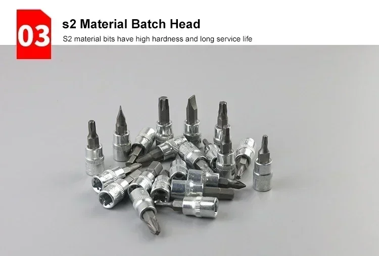 ②1/4” DR.Bit Sockets:FD4,FD5.5,FD7,PH1,PH2,PH3,HW3,HW4,HW5,HW6,HW7,HW8,T10,T12,T20,T25,T30,T40,PZ1,PZ1,PZ3——–21PC