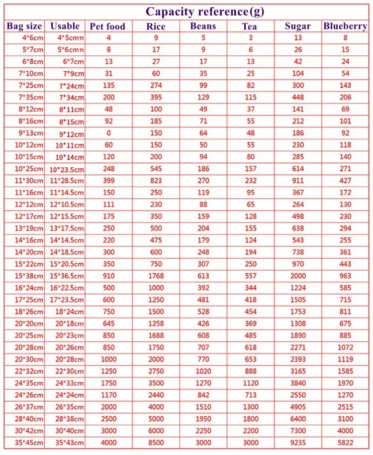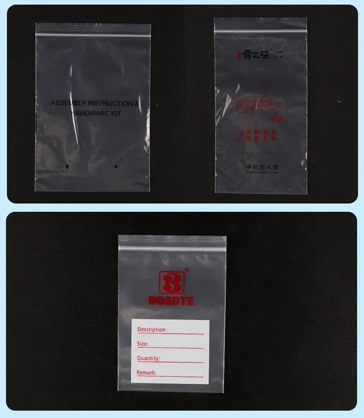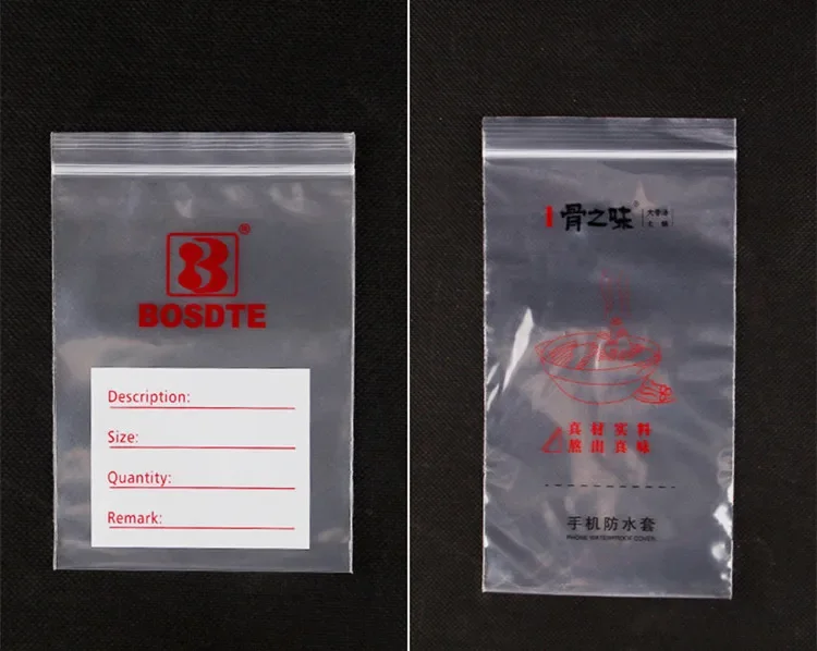 Bag Style 50micron Clear PE Ziplock Bags Material PE Thickness 50micron (=0.05mm) (1micron=0.01mm)Advantages Oxygen Resistance, Grease Proof, Moisture Proof, High Barrier, Food Grade Application Widely used in Snacks, Cookies, Nuts, Fruits, Frozen food, Tea, Coffee beans/powder, Gifts, etcFeatures With Re’ sealable zip lock options, easy to open and close.Extraction is on dead angle, protect sealing sex is strong, leak-proof quality.Humanized design of tear notches on sides, which makes tearing convenient. Express shipping Usually order more than US$68, we offer fast UPS/FedEx/DHL Bulk order If you need large qty, pls check with us in advance, thanksLogo File Production need .ai/.cdr/.psd/.pdf formats