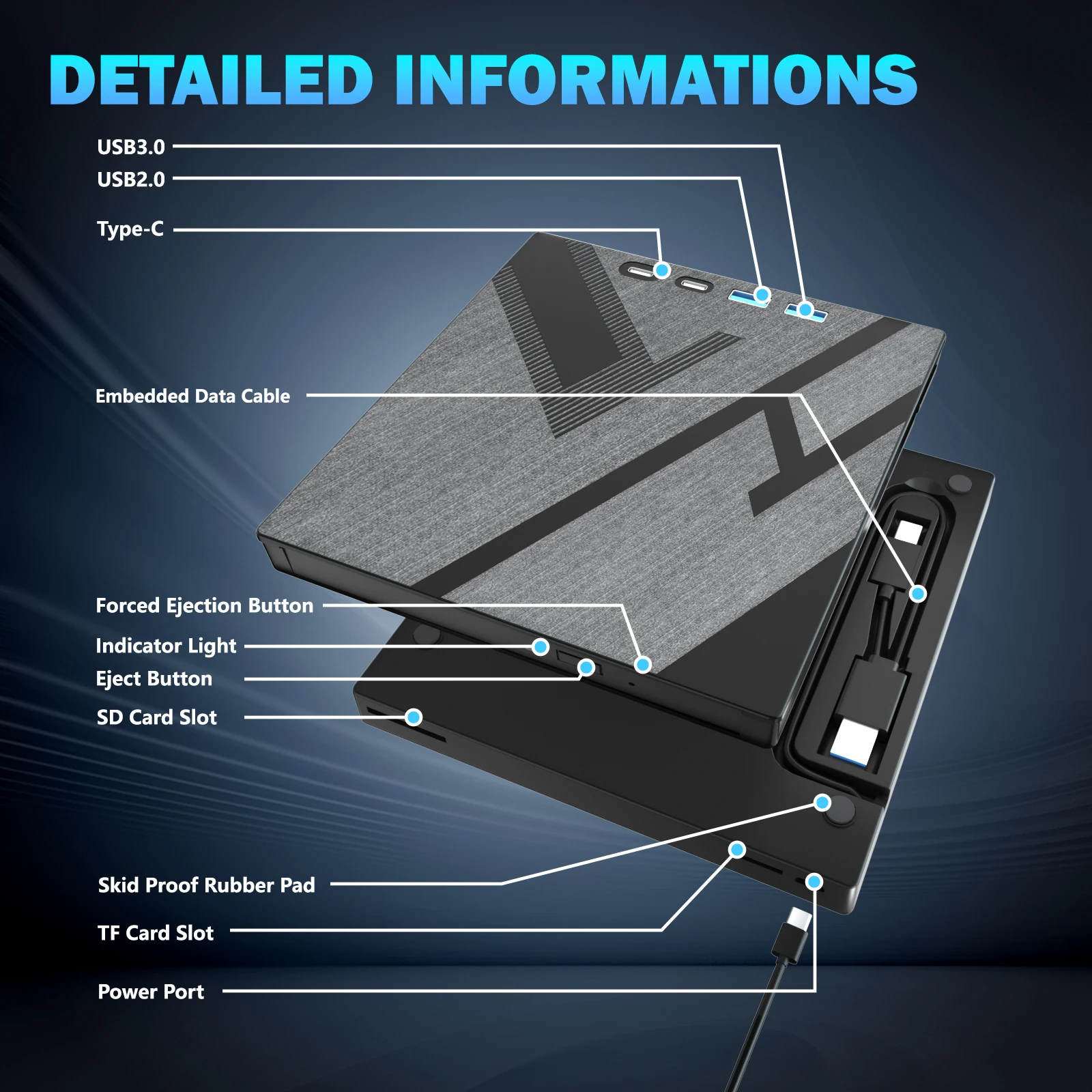 🔵 Multifunction:This 7-in-1 external Blu-ray drive offers versatile features. It has 1 SD card slot, 1 TF card slot, 2 USB-C ports, 1 USB 3.0 ports and 1 USB 2.0 ports for data transfer. It supports reading BD/DVD/CD discs and writing BD/DVD/CD discs. You can easily copy music, movies, and data files from SD cards, TF cards, or through the USB/Type-C ports to your computer. You can also transfer files from a Blu-ray player to an SD card, USB hard drive, or USB flash drive.