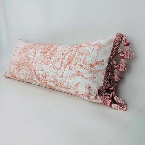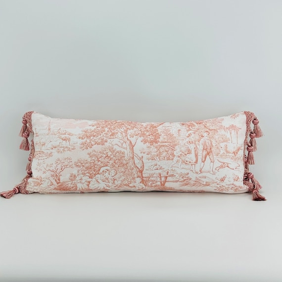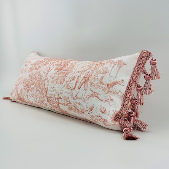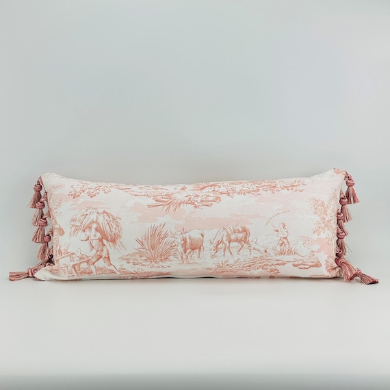 Blush Pink Toile Lumbar Pillow Cover with Optional Tassel Trim