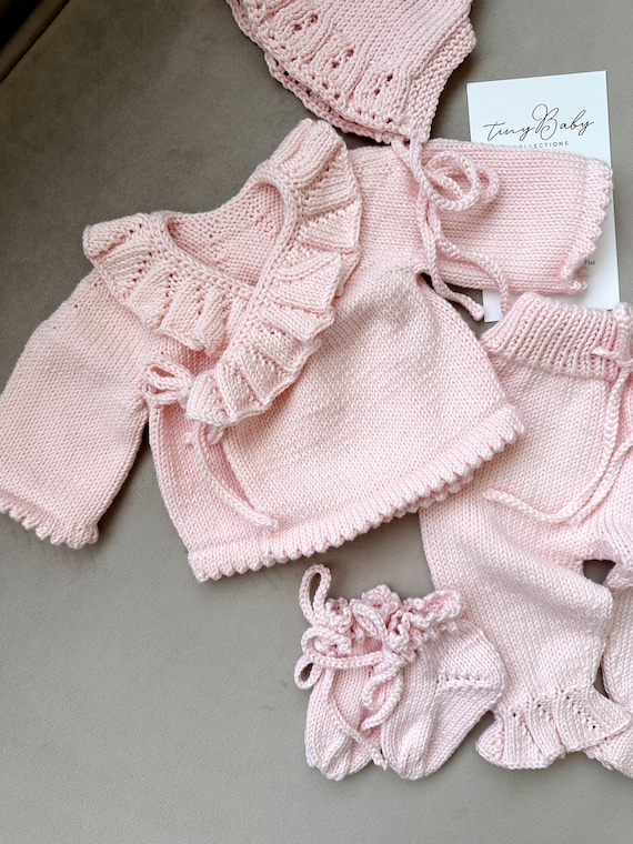 Hand knitted newborn baby girl coming home outfit with 100% organic cotton.