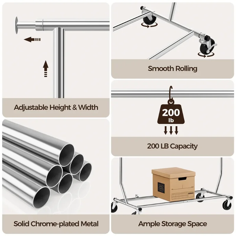 Heavy Duty Adjustable Collapsible Garment Rack, Stainless Steel, Chrome