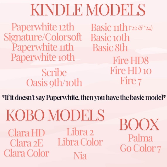 | Device | Paperwhite 12th 7", PW 12 Signature, Paperwhite Colorsoft, Paperwhite 11th 6.8", Signature (PW 11th), Paperwhite 10th Gen, 11th Gen Basic, 10th Gen Basic 2019, Oasis 10th Gen 2019, Scribe 2022, Scribe 2024, Amazon Fire 7, Amazon Fire HD 8, Amazon Fire HD10, Kobo Libra 2, Kobo Clara 2E, Kobo Clara HD, Kobo Nia, Kobo Libra Color, Kobo Clara Color, BOOX Palma, Boox Go Color 7 |
