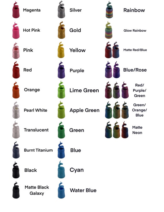 Black, Blue, Water Blue, Gold, Silver, Green, Apple Green, Orange, Pink, Purple, Red, Yellow, Pearl White, Lime Green, Rainbow, Burnt Titanium, Hot Pink, Magenta, Cyan, Matte Black Galaxy, green/blue/orange, red/purple/green, Matte Red/Blue, Glow Rainbow, Matte Neon, Translucent Clear, Blue/Rose, Glow Purple, Glow Yellow, Glow Blue, Glow Red (coral), Glow Green (mint), Green/Fuchsia, Black/Pink/White, Black/Red/Yellow, Black/Blue/Purple