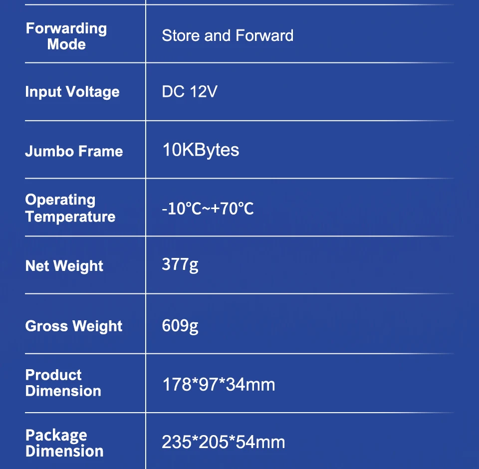 | Working environment | Working Temperature: 0-40°C; Storage Temperature: -40-70°C; Working Humidity: 10%-90%, non-condensing; Storage Temperature: 5%-95%, non-condensing; |