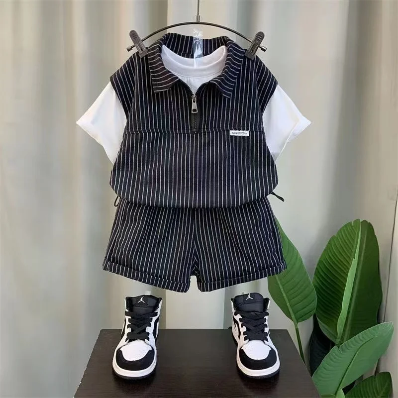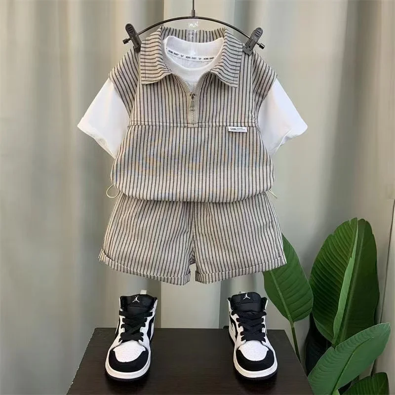 Korean Fashion Striped Short Sleeve Zipper Shirt And Shorts Two Piece Suit Baby Boys Summer Boutique Outfits Kids Sport Clothes