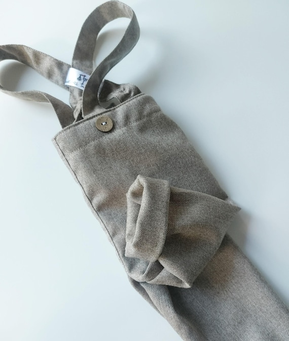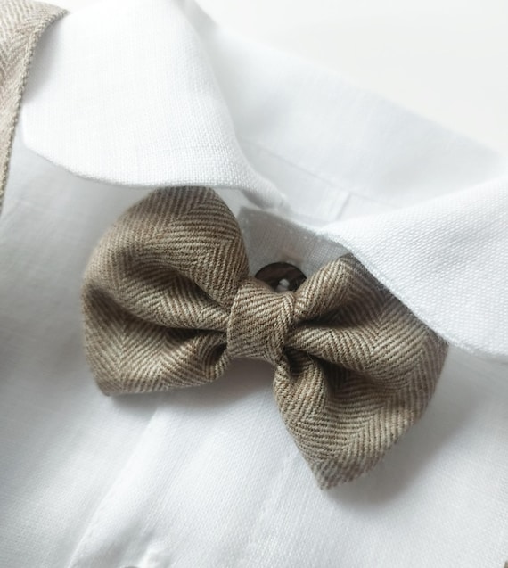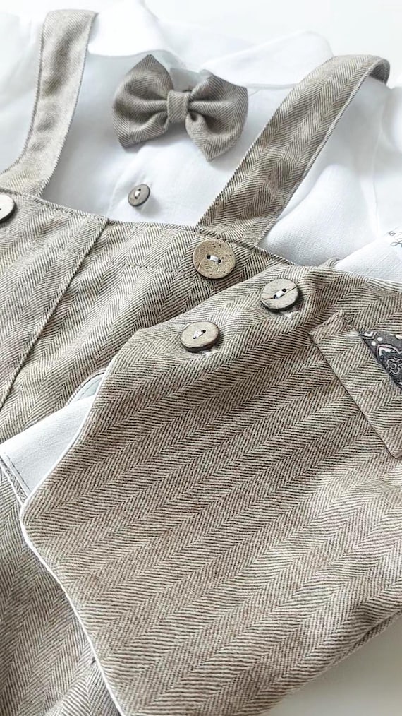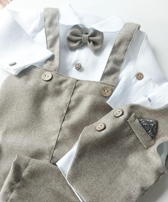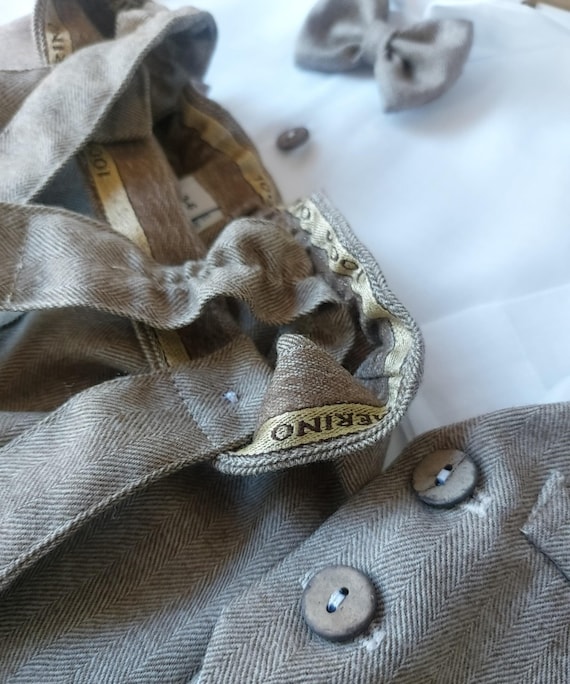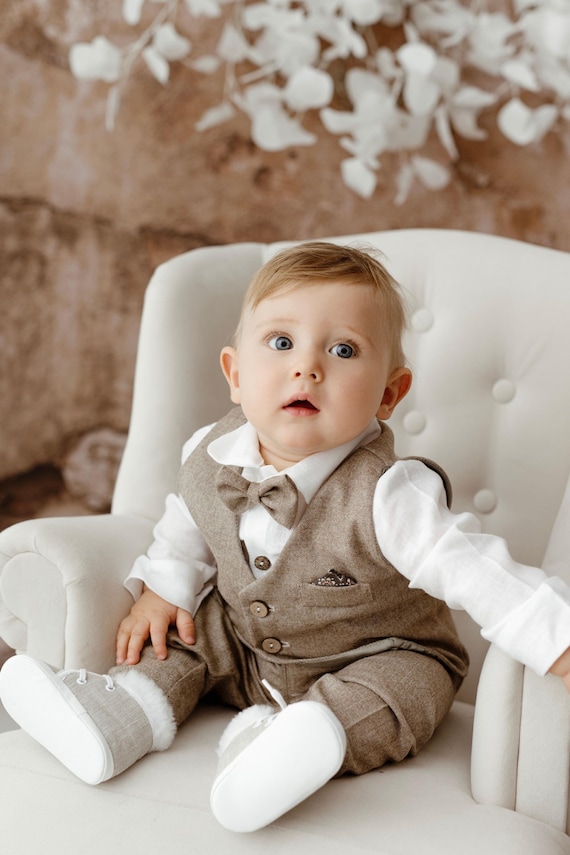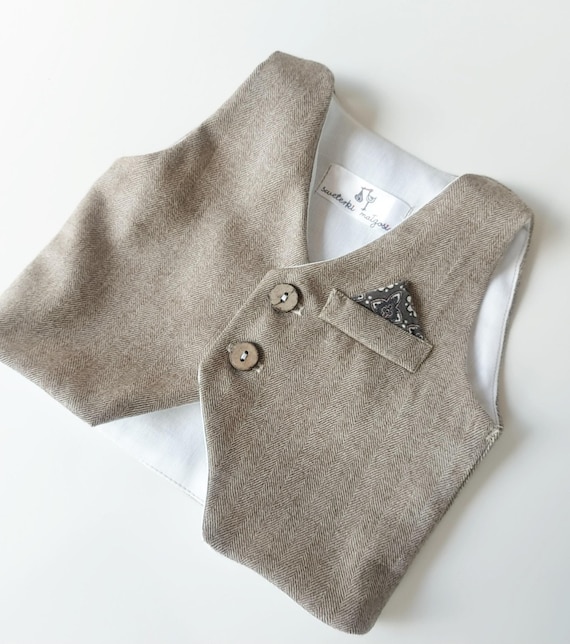 Merino Wool Baby Boy Christening Suit: Beige Herringbone Pants, Vest Option