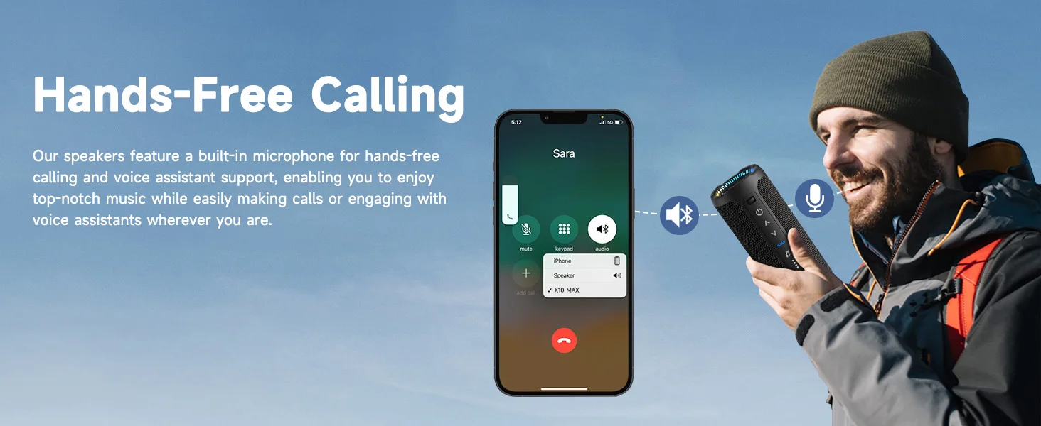 The wireless speaker’s built-in microphone allows you to take hand-free calls or use it as a conference speaker.