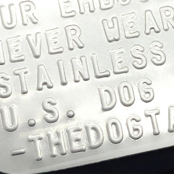 Our tag is designed to withstand EXTREME elements, made from genuine 304 grade stainless steel and embossed with state of the art military machinery, your text will never fade or wear out even if it scratched, burned, or submerged, unlike other tags which are made of paper or aluminium.
