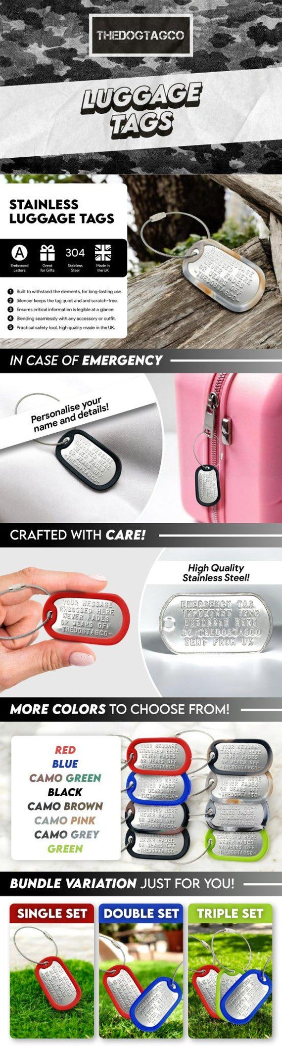 Personalised stainless steel luggage tag – custom metal embossed tags with Black rubber silencer provided!