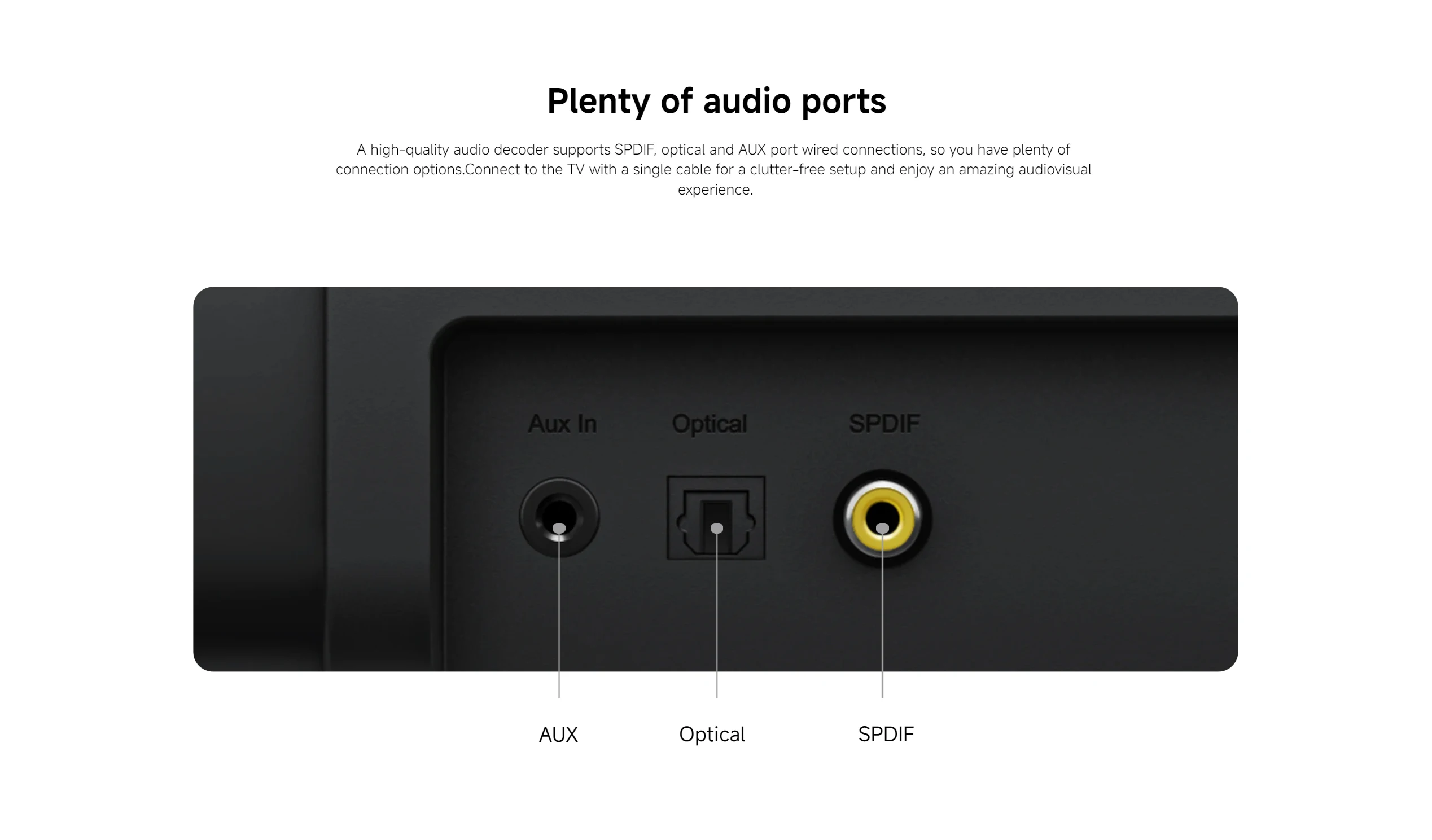 A high-quality audio decoder supports SPDIF, optical and AUX port wired connections, so you have plenty of connection options.Connect to the TV with a single cable for a clutter-free setup and enjoy an amazing audiovisual experience.