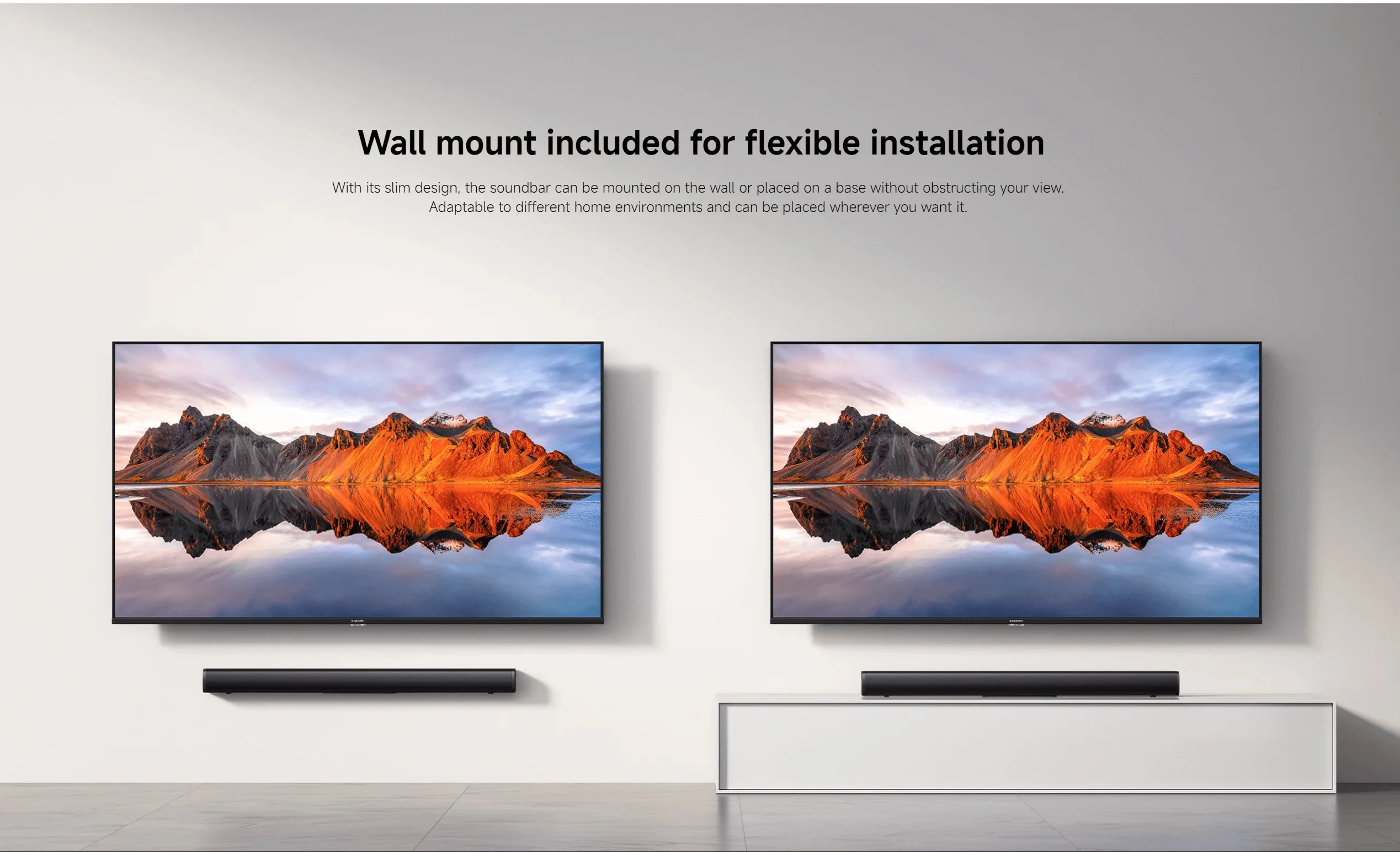 With its slim design, the soundbar can be mounted on the wall or placed on a base without obstructing your view.